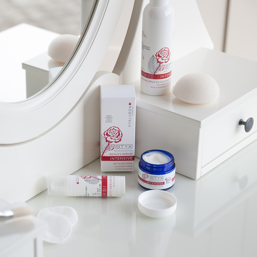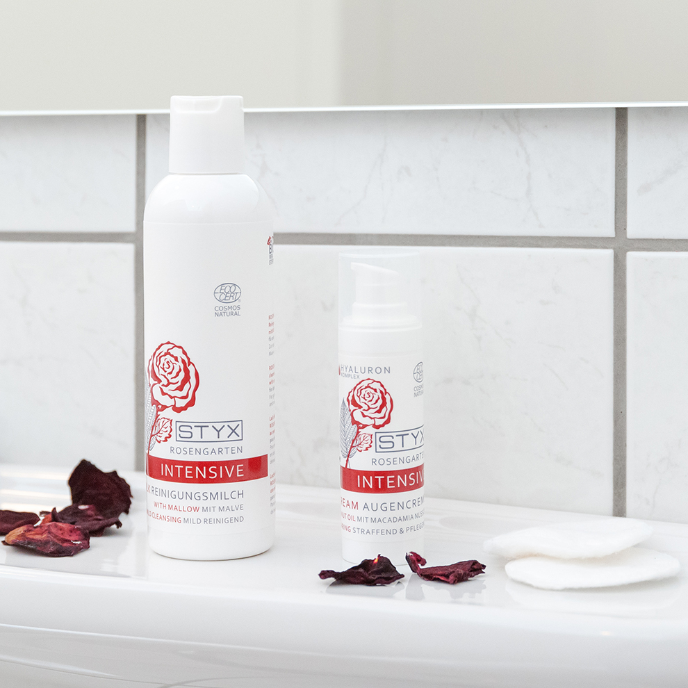 Eine Kosmetikserie auf rein pflanzlicher Basis, mit naturreinem Damaszena-Rosenöl und patentiertem, pflanzlichem Anti-Falten-Wirkstoff – STYX Rosengarten ist ein besonderes Verwöhnerlebnis mit hochaktiven, natürlichen Wirkstoffen (u.a. Vitamin A) für die anspruchsvolle, reife Haut. Kostbares Rosenöl stimuliert die Zellaktivität und verleiht der Haut neue Vitalität. Ausgesuchte, kaltgepresste Pflanzenöle, wie Jojobaöl und Macadamianussöl helfen, den Feuchtigkeitshaushalt der Haut auszugleichen und wirken vorzeitiger Faltenbildung entgegen. Der wundervoll sinnliche Duft der Damaszena-Rose wirkt harmonisierend auf die Seele!