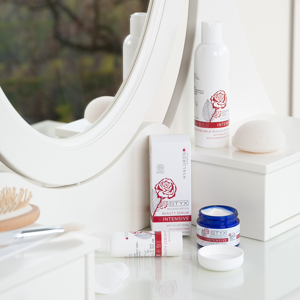 Gib Trockenheit und Fältchen keine Chance! Nach der Reinigung ist die Pflege an der Reihe. Bei der Produktauswahl spielen da dein Hauttyp und dein Alter eine entscheidende Rolle. Unsere Empfehlung: Die Kräutergarten Basic Gesichtscreme mit BIO-Jojoba. Sie eignet sich perfekt auch für den Hals- und Dekolleté-Bereich. Die Creme wurde für sehr trockene und/oder stark strapazierte Haut entwickelt, ist reich an Jojobaöl und Aloe Vera und sorgt für eine außerordentliche Nährstoff- und Feuchtigkeitsversorgung. Bei gestresster und geröteter Haut empfehlen wir dir die Verwendung von Hanf Gesichts- & Körperöl mit Ringelblumenöl, Patchouli und Ylang Ylang. Bei reifer Haut ist die Rosengarten Intensive Aufbaupflege eine gute Wahl - das reichhaltige Gelee Royal mit Hyaluron nährt, pflegt und stärkt deine Haut. Es sorgt für mehr Spannkraft und Prallheit und unterstützt die Verbesserung der Zellstruktur.