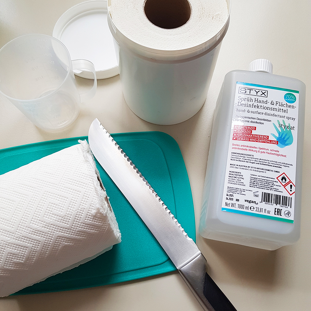Lichtschalter, Türklinken, Türgriffe oder die Arbeitsplatte abwischen? Ein paar DIY Desinfektionstücher sind praktisch um mal alles zu desinfizieren.