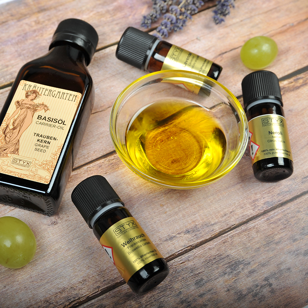 Die Zubereitung ist ganz einfach: Basisöl mit den ätherischen Ölen vermischen, am besten in ein dunkles Glasfläschchen geben, gut schütteln, und schon ist das Massageöl fertig!