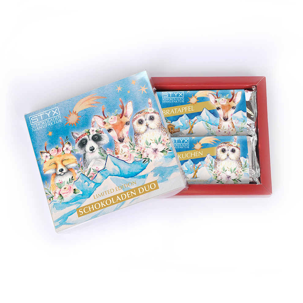Liebevoll bedruckte Duo-Box "The winterwonderland" für die gefüllten 70g Pralinenriegel der STYX Schokoladenmanufaktur.