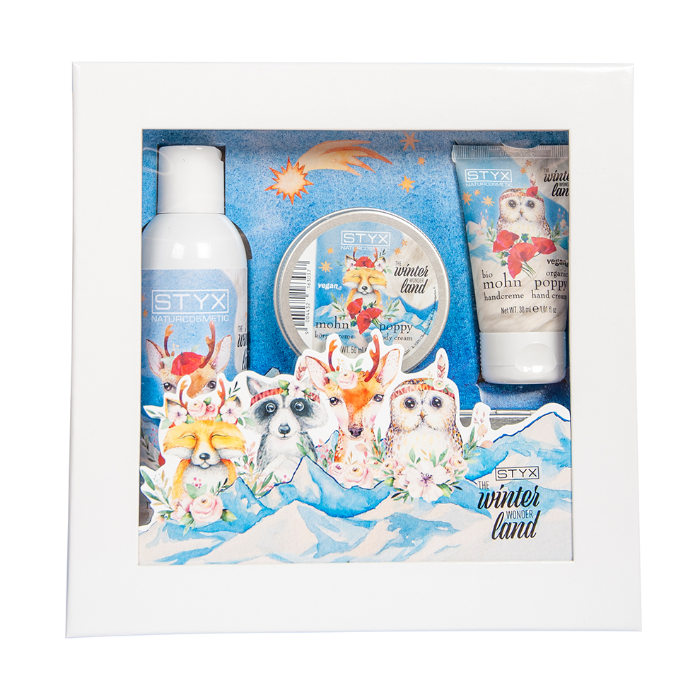 Die liebevoll bedruckte Weihnachtsbox ist befüllt mit Mohn Handcreme 30ml, Mohn Duschgel 30ml und Duftöl Winterzauber 10ml.